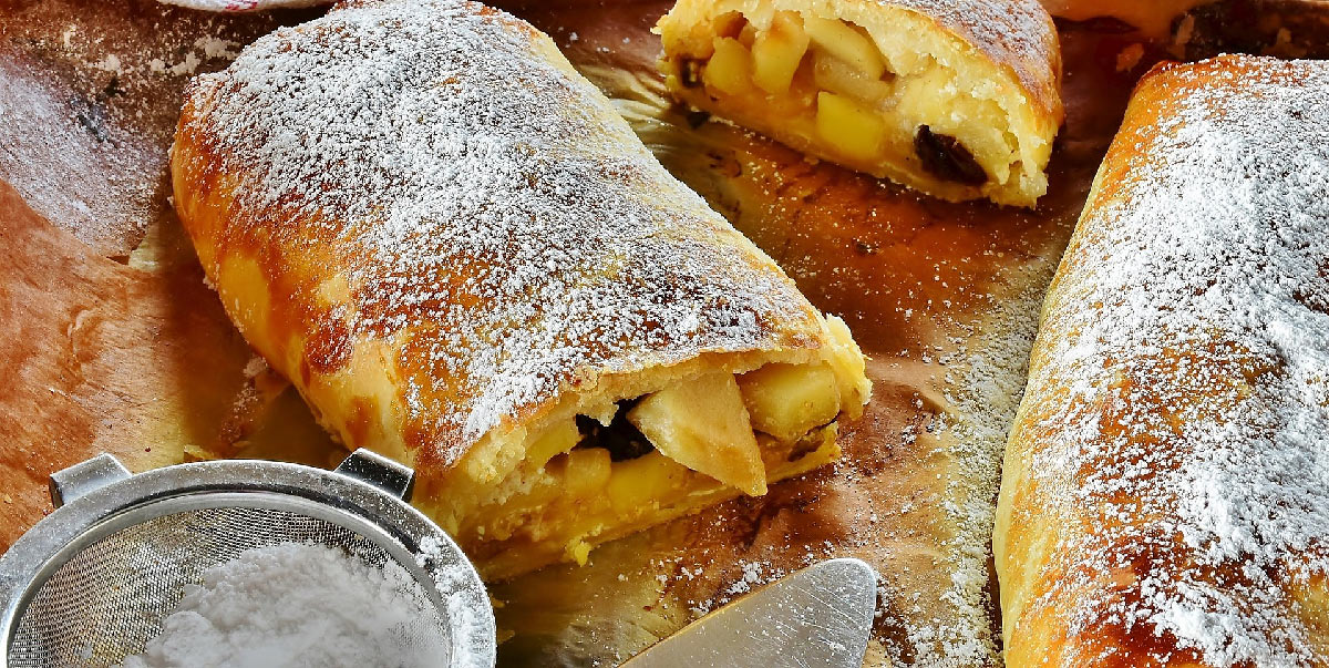 7. Butter zerlassen und mit einem Teil den Teig besteichen. Dann die Strudelmasse hineingeben.