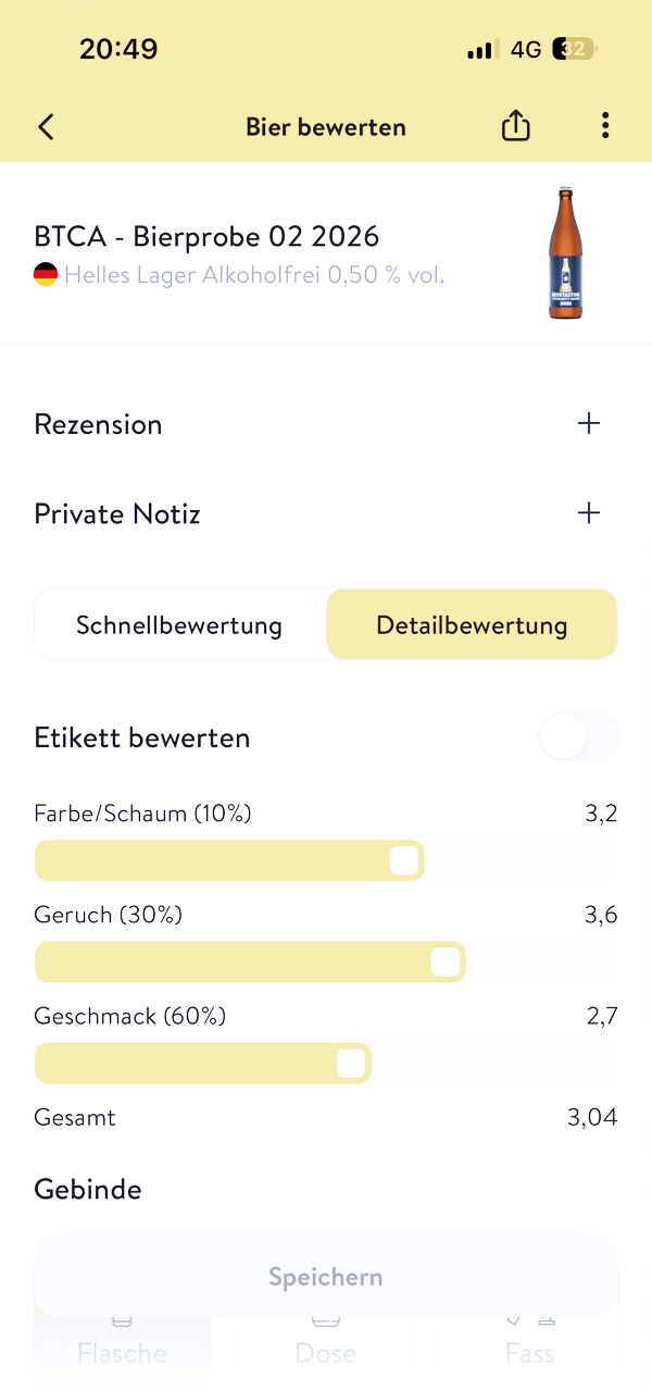 Der Barcode wird gescannt und dann hat man die Chance in der App eine Bewertung abzugeben. Diese strukturiert sich in Schnellbewertung oder Detailbewertung. Bei der Detailbewertung wird Etikett (nicht in unserem Fall), Farbe/Schaum, Geruch und Geschmack bewertet. Ebenso wie das Gebinde und der Ort der Verkostung. Vorgegeben ist nur die Stammwürze, der Alkoholgehalt und der Bierstil. Wie eben bei einem richtigen Wettbewerb. Die Idee ist einfach genial und funktioniert zuverlässig. Wir haben die 12 Biere in Kürze verkostet und eingescannt. Da es sich um alkoholfrei Bier handelte ist das einfach gewesen und hat mit mehreren Leuten wirklich Spass gemacht. Nun sind wir gespannt auf die Ergebnisse.