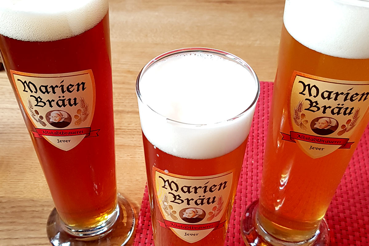 Das Gebäude des Marienbräu stammt aus dem 15. Jahrhundert und ist eines der ältesten In Jever. Es war damals im Besitz der Familie Münchhausen und ist heute Treffpunkt für gutes Essen und leckeres Bier. Es ist liebevoll mit schönen Bierzitaten an der Wand und glänzenden Gärtanks hinter der Theke eingerichtet. Der Außenbereich ist mit einem Biergarten und den Einblick durch die Fensterscheiben, durch die man die komplette Brauanlage sehen kann, ausgestattet. Da wir im Juni gekommen sind, gab es noch ein gutes Maibockbier, zusätzlich zu den zwei Sorten Hell und Dunkel. Ganz nach dem Motto Gerste und hopfen sind Lebenstropfen, haben wir alle drei Biere verkostet.