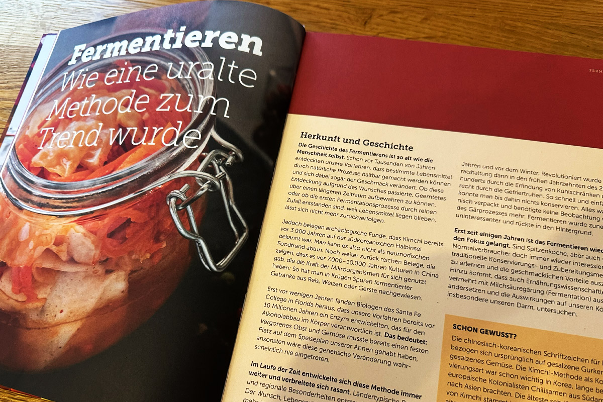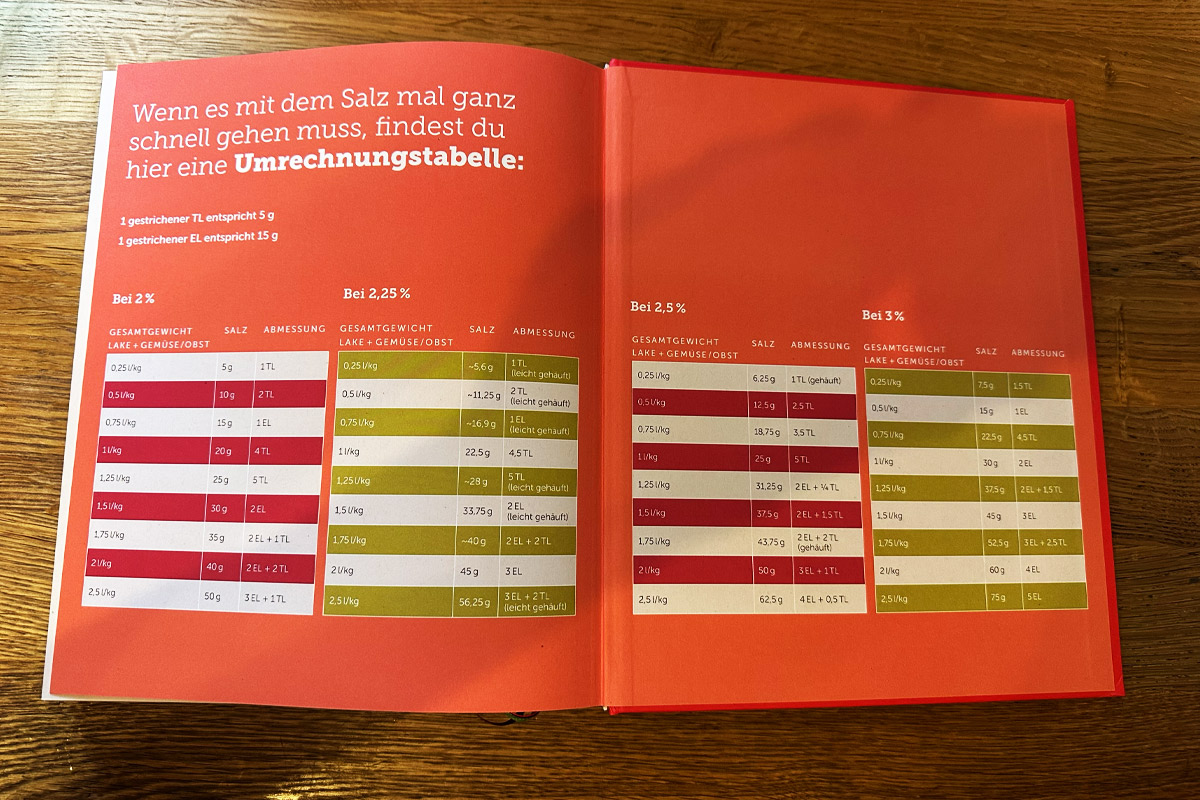 Wir haben hier eines der wohl best recherchiertest Bücher zum Thema fermentieren in unseren Händen. Das Buch umfasst mehr als 300 Seiten voller Grundlagen, Rezepte und Anleitungen, Wie man richtig fermentiert. Aber eben auch eine wunderbare Einleitung in die Welt der Früchte und Gemüsesorten. Auch einen kleinen Abriss über die Geschichte des Fermentieren stellt das Buch bereit. Die ersten archäologischen Funde gehen bis vor 10.000 Jahren auf den asiatischen Raum zurück. Dort finden sich die ersten Mikroorganismen in Krügen und Behältern. Kimchi ist ein beliebtes Rezept aus gesalzenen Gurken oder gesalzenes Gemüse, das eingelegt und fermentiert wurde.