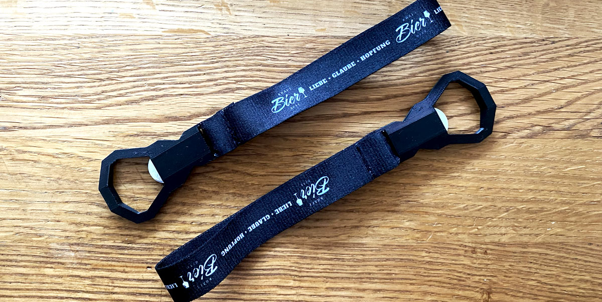 Besonders beliebt: die hochwertigen Flaschenträger, Körbe und Bierkühltaschen – durchdacht, robust und im Design stets ein Hingucker. Ein echtes Highlight ist auch der neue Flex-Flaschenöffner: Mit einem individuell bedruckbaren Band lässt er sich unkompliziert an Gürtelschlaufen, Taschen oder Rucksäcken befestigen – und ist somit immer griffbereit. Der Rahmen besteht aus leichtem Kunststoff, wodurch der Öffner nicht nur flexibel einsetzbar, sondern auch kaum spürbar ist.